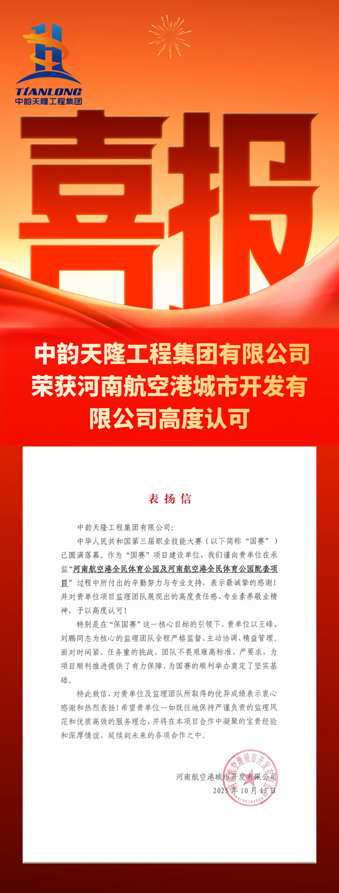 10月15日,在中华人民共和国第三届职业技能大赛圆满落幕之际,中韵天隆工程集团有限公司作为“国赛”项目监理单位,收到了来自河南航空港城市开发有限公司的高度赞扬信。信中特别提到了中韵天隆集团在承监“河南航空港全民体育公园及河南航空港全民体育公园配套项目”过程中所展现出的辛勤努力与专业支持。