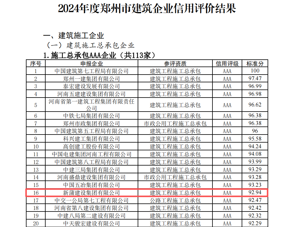 近日,郑州市城乡建设局发布《关于发布2024年度郑州市建筑企业信用评价结果的通告》(郑建文〔2025〕109号),新蒲建设集团有限公司凭借深厚的行业积淀、扎实的技术实力与优异的信用表现,在此次评价中成功斩获建筑工程施工总承包AAA级荣誉。