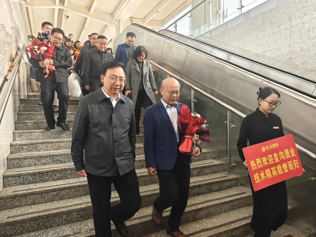 金秋传捷报,馥香绽荣光!10月29日,备受行业瞩目的第五届国家级白酒评委职业技能竞赛圆满落幕,皇沟酒业技术天团凭借深厚的专业积淀与精湛的品评技艺,在全国众多顶尖选手的激烈角逐中脱颖而出,再度为豫酒争光,为馥香添彩!10月31日,皇沟酒业党委书记、副董事长张树强,党委委员、中心经理石晏,工会主席、副总经理张侠前往车站迎接,以最诚挚的敬意与热烈的掌声,致敬这支在全国顶尖赛事中彰显豫酒匠心的技术队伍。