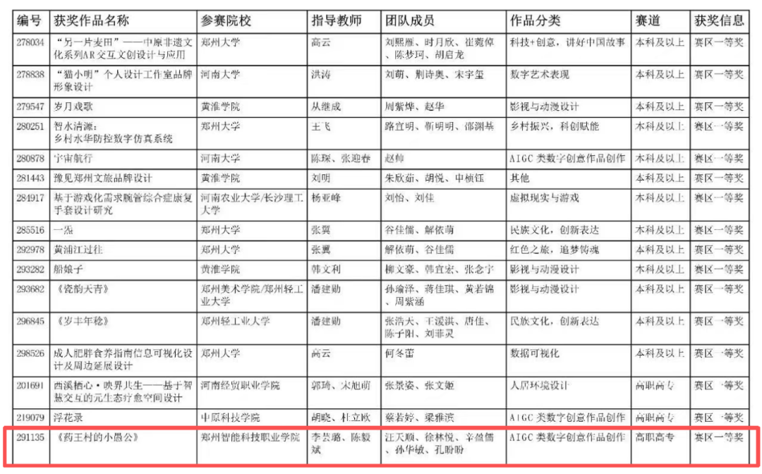 近日,2025年全国大学生数字媒体科技作品及创意竞赛河南赛区获奖名单正式公布。在李芸璐、陈毅彬两位老师悉心指导下,由汪天顺、徐林悦、辛盈儒、孙华敏、孔盼盼等同学组成的创作团队倾力打造的作品《药王村的小愚公》荣获AIGC类数字创意作品创作高职高专组一等奖。