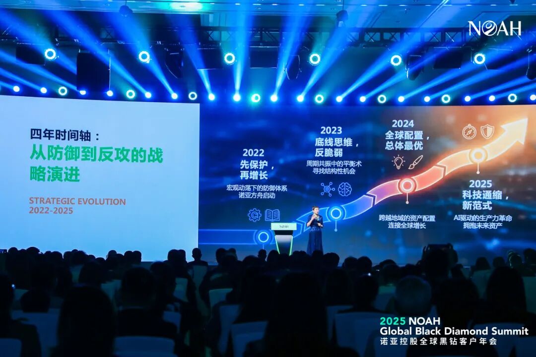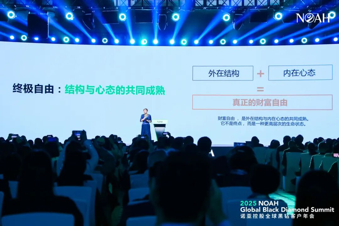 在12月8日举办的「AI同行·共创未来」2025第18届诺亚控股全球黑钻客户年会·澳门上,诺亚控股联合创始人、董事局主席汪静波女士发表主题演讲《从混沌到清晰,为您的全球家族打造专属操作系统》。基于过去二十余年的世界观察、华人经验以及经过验证的资产配置智慧,她指出,未来十年,全球华人家族财富管理迎来关键时期,并分享面向全球华人黑钻客户的未来战略。