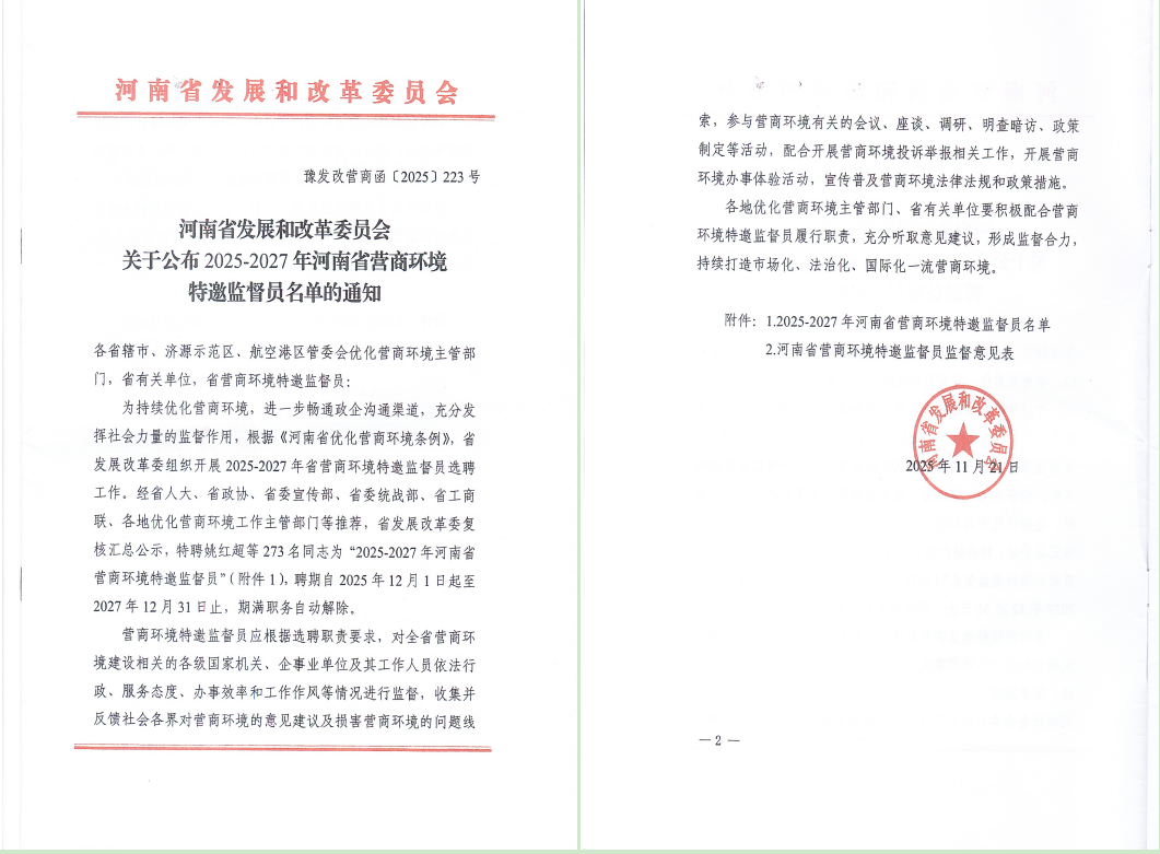 近日,河南省发展和改革委员会正式启动2025—2027年度营商环境特邀监督员选聘工作。河南华东电缆股份有限公司党支部书记、董事长陈剑平成功入选,获聘为该批次特邀监督员。此次选聘经多部门联合推荐、综合复核并公示确定,监督员队伍涵盖企业、学界、协会等多领域代表,旨在构建广泛参与的社会监督机制。