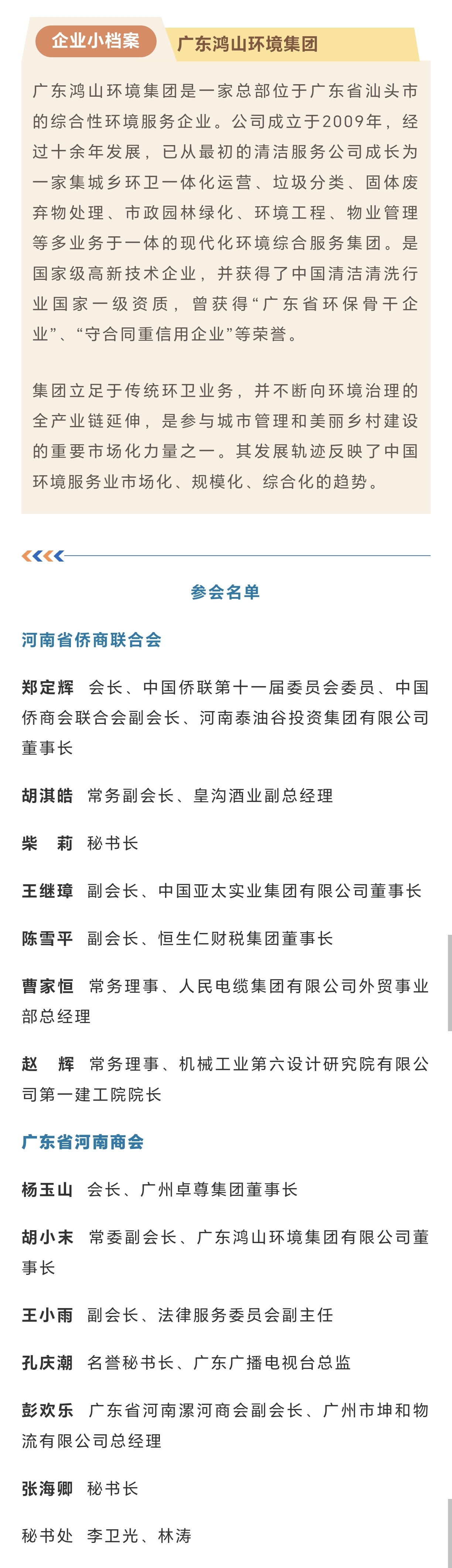 广东省河南商会常委副会长胡小末首先致欢迎辞,对家乡侨商会考察团的到来表示热烈欢迎,并简要介绍了广东鸿山环境集团的发展历程。胡小末表示,此次河南省侨商联合会的到访,结识了新的朋友,将来一定会有新的发展。