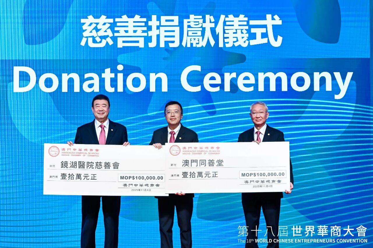 大会现场,澳门中华总商会理事长马志毅代表大会分别向澳门同善堂、镜湖医院慈善会各捐款10万澳门元,借此支持澳门慈善事业发展。