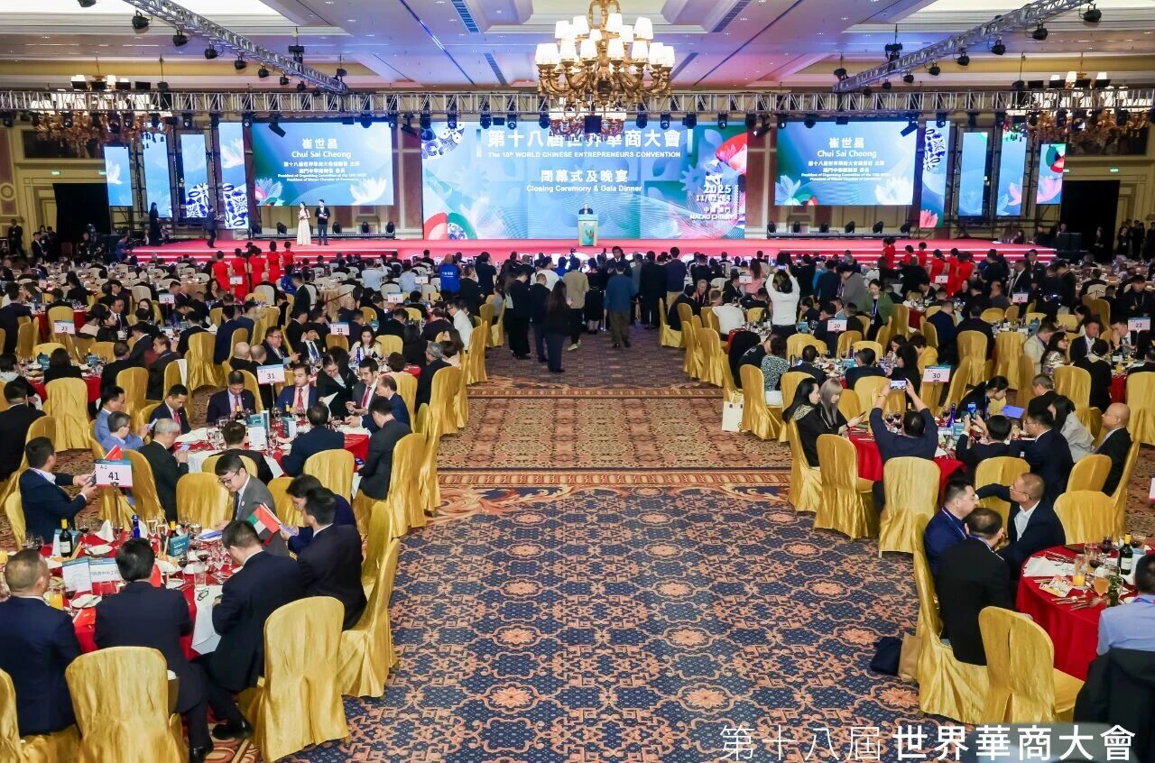11月4日晚,为期2天的第十八届世界华商大会圆满落下帷幕。作为大会收尾的核心环节,闭幕式围绕成果总结、精神传承与未来展望三大核心内容展开,为这场全球华商盛会画上圆满句号。全国政协副主席何厚铧、澳门特区行政法务司司长黄少泽、澳门中联办副主任张应杰、中国侨联副主席程红、中国贸促会副会长陈建安、香港中华总商会会长蔡冠深、新加坡中华总商会会长高泉庆、泰国中华总商会主席林楚钦、澳门中华总商会会长崔世昌等担任主礼嘉宾。河南省侨商联合会代表团参与见证这一重要时刻。
