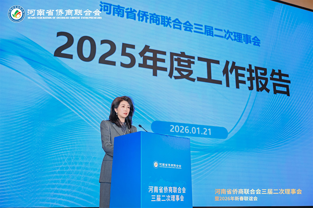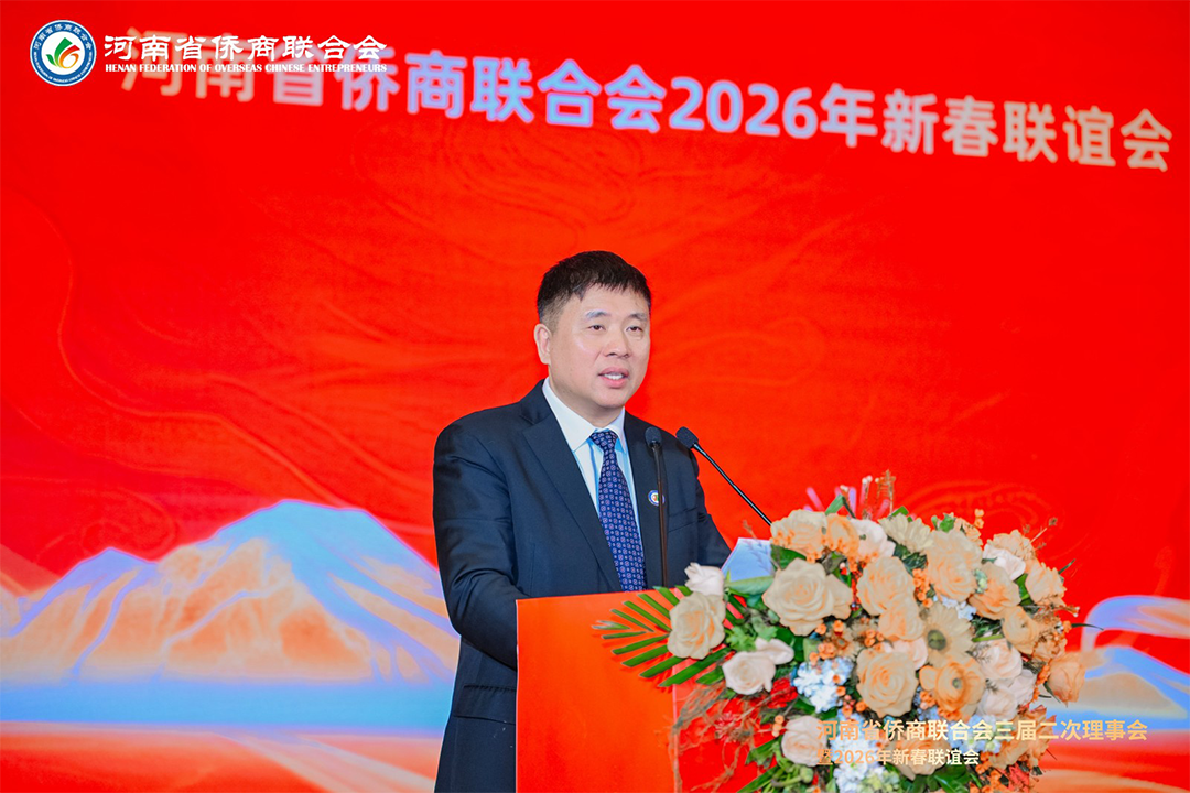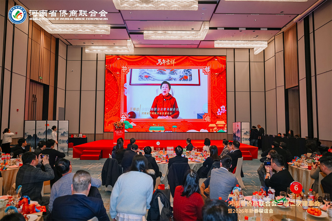 岁序更替,华章日新。1月21日下午,河南省侨商联合会三届二次理事会暨2026年新春联谊会隆重举行。河南省侨联党组书记、主席杨海强,党组成员、副主席吕剑,文化经济联络部副部长李丹丹;河南省人民政府侨务办公室侨务事务处处长、一级调研员王润玲,侨务综合处二级调研员王涛,侨务事务处副处长、三级调研员罗文洁;郑州市侨联党组书记、主席时旭,党组成员、一级调研员贾风雷;开封市侨联党组书记、主席胡广军,秘书长冯志祺;鹤壁市侨联党组书记、主席赵小玲,党组成员、副主席付英;焦作市侨联党组书记、主席王恒进;濮阳市侨联党组书记、主席朱腾强;商丘市侨联党组书记、主席赵劲松;周口市侨联党组书记、主席刘淑红,办公室主任王雪伟;平顶山侨联主席王文玉;济源市侨联主席王会东;许昌市侨联党组成员、副主席郭惠霞;驻马店市侨联党组成员、副主席张玮,秘书长谢威;信阳市侨联秘书长雷伟;鹤壁市淇县统战部副部长、侨联主席董瑞民;河南大学党委统战部副部长黄鑫,河南财经政法大学管理学部执行部长、中国(河南)企业出海研究院院长王永伟,郑州智能科技职业学院副校长王发清,法国河南同乡会会长祝晓琳,马来西亚工商协会副会长杨蒂娜,美国加州河南促进会会长、海外炎黄文化传承基金会董事长张丽莉,澳大利亚河南青年会会长王皓,清华大学建筑设计研究院文化旅游院副院长郑波,清河云选创始人赵永,里斯中国战略研修院增长中心合伙人郭君仕等受邀参会,与我会会长郑定辉,驻会执行会长王广国,党支部书记罗建中,执行会长陈向辉、李明献、宋保山,常务副会长苗青、刘喜顺、王如民、赵天星、张士勇、楚喆、胡淇皓、姜正金、石聚领、马德寿,秘书长柴莉,副会长王继璋、王建棋、宋军、侯占元、王培雷、赵静、陈雪平、罗利、周伟民、王世印、郑海霞、杜新峰、党秀浩、梁斌、代月红、赵辉、管世昌、王永伟、徐萌婕,以及其他全体理事会成员欢聚一堂,在温馨祥和、昂扬奋进的氛围中,迎接充满希望的丙午马年。