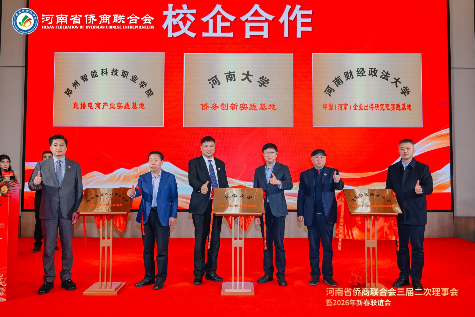 为促进产学研的深度融合,大会还举行了庄重的校企合作揭牌仪式。河南省侨商联合会与河南大学、河南财经政法大学中国(河南)企业出海研究院、郑州智能科技职业学院正式建立战略合作关系,标志着商会在推动产教融合、人才共育、科研转化方面迈出了坚实一步,将为会员企业发展注入更强劲的智力动能。