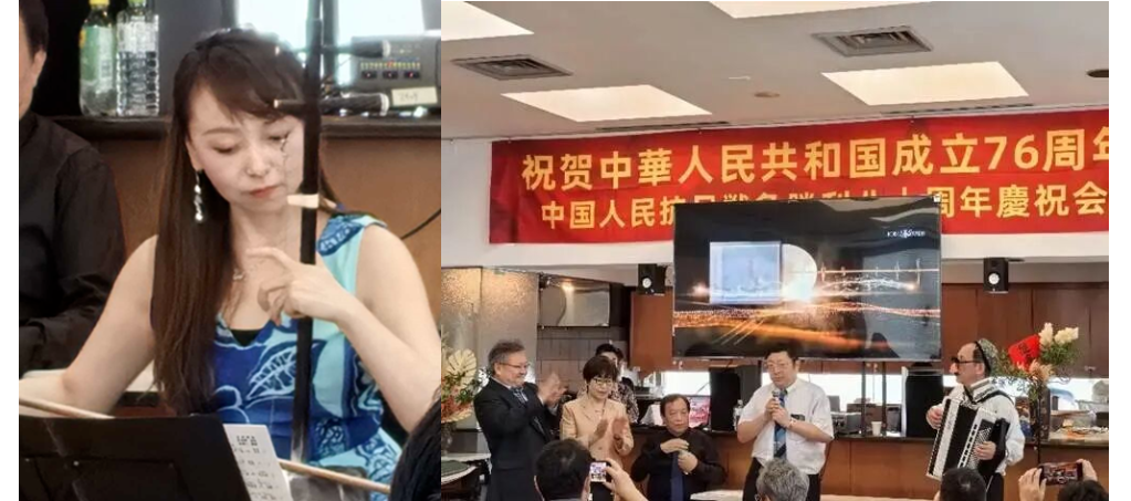 下半场首先是朱铭江演出了发自肺腑、感人至深的诗朗诵《但愿人长久》,令现场观众无不动容。其后二胡演奏家沈琳独奏《花雨夜》《阿里山的姑娘》,用悠扬婉转的二胡声勾起了大家浓浓的乡愁。而来自新疆能歌善舞的曹小冬又用特有的喜剧风格带来了手风琴伴奏的家乡歌曲《达坂城的姑娘》,将乡愁变成了笑声。贾广鑫、李岳和杨嘉丽为大家朗诵了台湾诗人余光中的诗歌《乡愁》《乡愁四韵》和席慕容的《父亲的草原母亲的河》,寄托了游子对家乡的思念,也表达了海外华人希望台湾早日回归的心愿。兼任日本华侨华人文学艺术联合会名誉会长的作家、翻译家、我会唐亚明名誉会长最后为大家献上了耳熟能详的歌曲《雁南飞》,歌声瞬间将大家引领到了一种令人怀念的氛围。之后,大会以齐唱《东方之珠》抒发了自己对祖国的眷恋和热爱,演出告以结束。