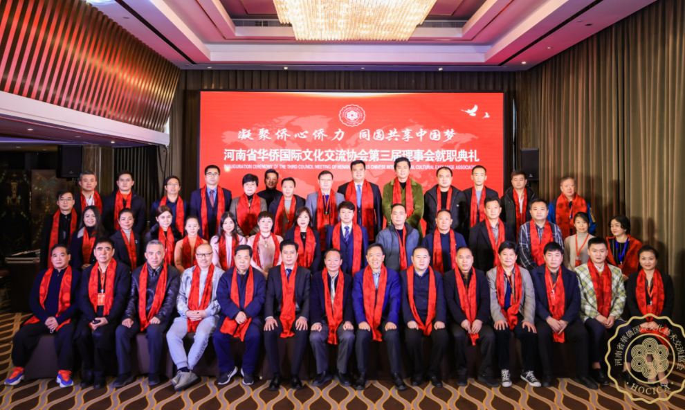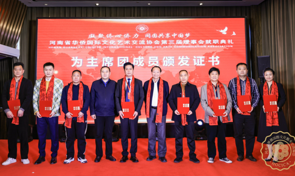 在就职典礼仪式上,协会副主席、中共省委宣传部原二级巡视员郑延保宣读海内外贺信贺电。新当选的第三届理事会领导班子代表集体上台与大家见面,河南省侨联二级巡视员刘合生、河南省民政厅社会组织管理局副局长张新志分别为新一届主席团成员颁发荣誉证书。