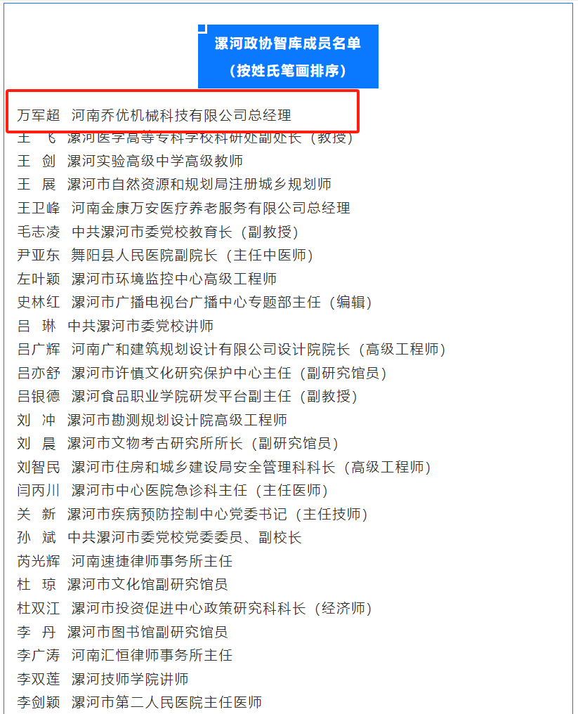 为深入贯彻党的二十大精神和《中共中央关于新时代加强和改进人民政协工作的意见》,充分发挥专家智力支持作用,汇聚更多智慧和力量,助推漯河经济社会高质量发展。在全市各单位推荐的基础上,市政协调查研究室对漯河政协智库推荐人选进行审核,经市政协主席会议审定,决定聘任55人为漯河政协智库成员,聘期与八届市政协届期相同,其中我会常务理事万军超入选名单。