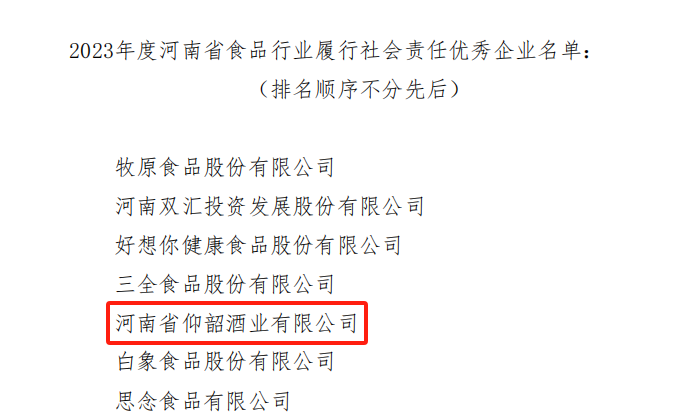 5月15日,河南省食品工业协会颁布了“2023年度河南省食品行业履行社会责任优秀企业名单”中,省侨商会副会长单位河南仰韶酒业有限公司凭借其在社会责任领域的杰出贡献,荣获了“2023年度河南省食品行业履行社会责任优秀企业”的崇高荣誉。这一奖项不仅是对仰韶酒业过去一年来积极践行企业社会责任的认可,也是对其在推动行业发展、环境保护、公益慈善等方面所做努力的高度赞扬。