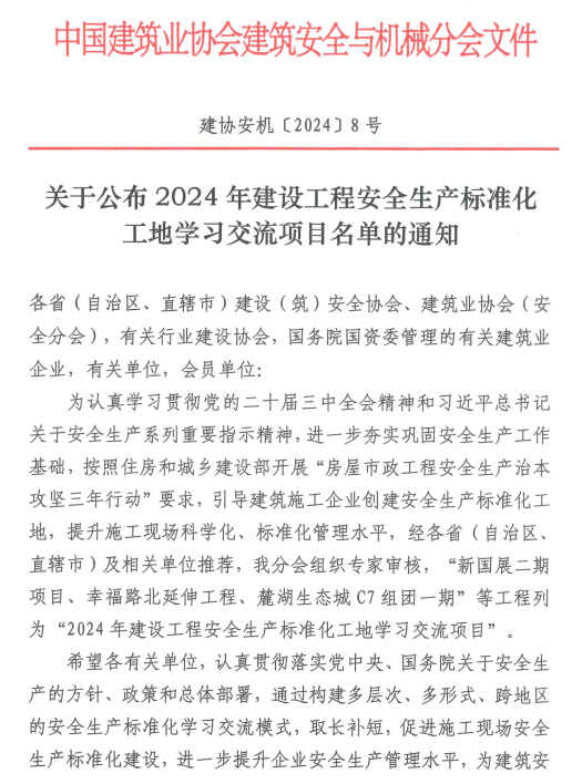 近日,中国建筑业协会建筑安全与机械分会正式公布了《2024年建设工程安全生产标准化工地学习交流项目名单》,