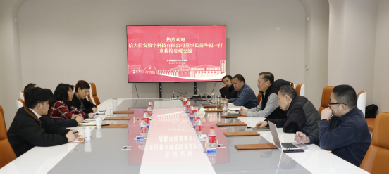 12月17日,信大信安数字科技公司董事长苗华锐、副总经理周航,金水银胜董事长王云仙一行到郑州智能科技职业学院参观交流。校长王广国,副校长王发清及相关部门负责人陪同座谈。
