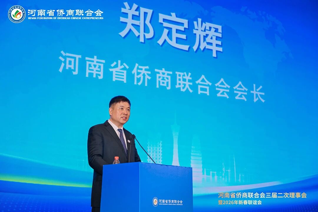 岁序更替,华章日新。1月21日下午,河南省侨商联合会三届二次理事会暨2026年新春联谊会隆重举行。河南省侨联党组书记、主席杨海强,党组成员、副主席吕剑,文化经济联络部副部长李丹丹;河南省人民政府侨务办公室侨务事务处处长、一级调研员王润玲,侨务综合处二级调研员王涛,侨务事务处副处长、三级调研员罗文洁;郑州市侨联党组书记、主席时旭,党组成员、一级调研员贾风雷;开封市侨联党组书记、主席胡广军,秘书长冯志祺;鹤壁市侨联党组书记、主席赵小玲,党组成员、副主席付英;焦作市侨联党组书记、主席王恒进;濮阳市侨联党组书记、主席朱腾强;商丘市侨联党组书记、主席赵劲松;周口市侨联党组书记、主席刘淑红,办公室主任王雪伟;平顶山侨联主席王文玉;济源市侨联主席王会东;许昌市侨联党组成员、副主席郭惠霞;驻马店市侨联党组成员、副主席张玮,秘书长谢威;信阳市侨联秘书长雷伟;鹤壁市淇县统战部副部长、侨联主席董瑞民;河南大学党委统战部副部长黄鑫,河南财经政法大学管理学部执行部长、中国(河南)企业出海研究院院长王永伟,郑州智能科技职业学院副校长王发清,法国河南同乡会会长祝晓琳,马来西亚工商协会副会长杨蒂娜,美国加州河南促进会会长、海外炎黄文化传承基金会董事长张丽莉,澳大利亚河南青年会会长王皓,清华大学建筑设计研究院文化旅游院副院长郑波,清河云选创始人赵永,里斯中国战略研修院增长中心合伙人郭君仕等受邀参会,与我会会长郑定辉,驻会执行会长王广国,党支部书记罗建中,执行会长陈向辉、李明献、宋保山,常务副会长苗青、刘喜顺、王如民、赵天星、张士勇、楚喆、胡淇皓、姜正金、石聚领、马德寿,秘书长柴莉,副会长王继璋、王建棋、宋军、侯占元、王培雷、赵静、陈雪平、罗利、周伟民、王世印、郑海霞、杜新峰、党秀浩、梁斌、代月红、赵辉、管世昌、王永伟、徐萌婕,以及其他全体理事会成员欢聚一堂,在温馨祥和、昂扬奋进的氛围中,迎接充满希望的丙午马年。