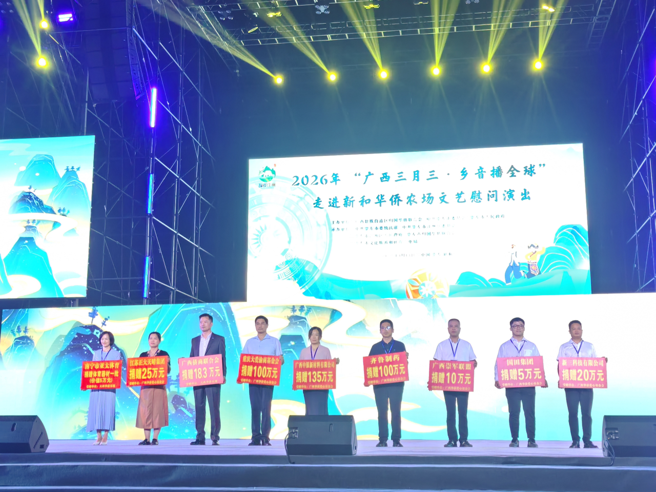 4月14日晚,2026年“广西三月三·乡音播全球”走进新和华侨农场文艺慰问演出活动,在江州区新和镇“夜新和”非遗文旅主题街区盛大启幕。海内外侨商侨领、归侨侨眷、华侨农林场职工、高校青年师生等各界代表1000余人欢聚一堂,共叙侨乡邻里温情,共谋边疆同心发展。本次活动由自治区侨联,崇左市委、市政府主办。中国侨联兼职副主席,自治区侨联党组书记、主席陈洁英与崇左市委常委、统战部部长杨海林出席并致辞,向广大侨乡和侨胞传递了党和政府的深切关怀与温暖。