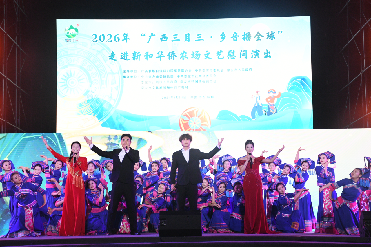 捐赠仪式后,文艺慰问演出正式拉开帷幕。活动现场灯火璀璨、暖意融融。《归侨的故事》《故里侨乡》《甜甜的江州》等饱含民族风情与侨乡特色的节目轮番登台。木棉组合带来的《呗侬情深》《呗呗侬侬》曲调欢快、乡情醇厚绵长,唱出壮族儿女与归侨侨眷亲如一家、同心相融的美好画面。越南青年代表携手新和华侨农场群众共同演唱越南歌曲《客人来到我家乡》《越南—中国》,让歌声跨越国界、友谊联结心灵,将慰问演出的气氛推向了高潮。台下掌声此起彼伏,观众们沉浸在浓郁的民族风情与边关侨乡的热烈氛围之中。