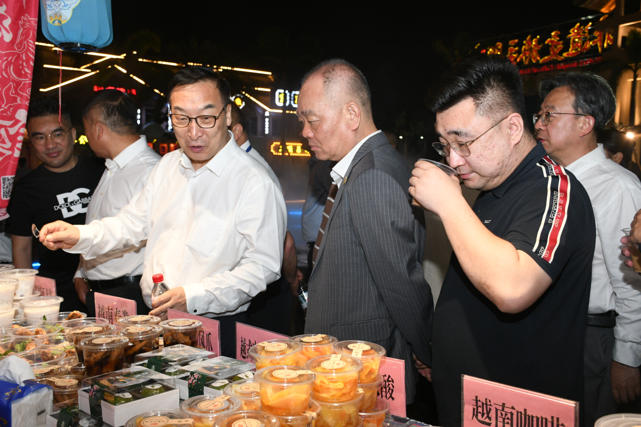 现场侨商、职工、游客们驻足品尝特色美食
